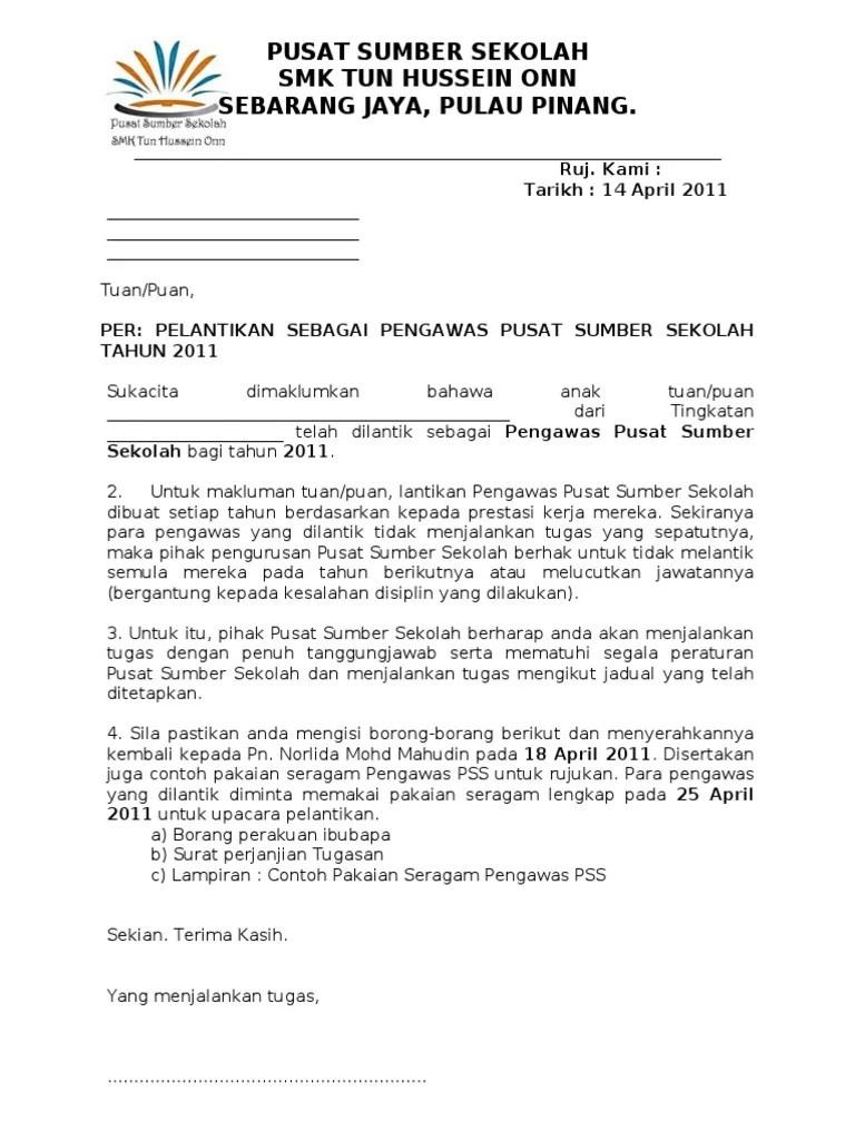 Sukacita dimaklumkan , jawatankuasa disiplin dan pengawas sekolah ini . View surat pelantikan pengawas 2020.doc from business misc at islamic science. Perkara di atas adalah dirujuk, 2. Pelantikan sebagai pengawas sekolah tahun 2015. Perkara di atas adalah dirujuk,.